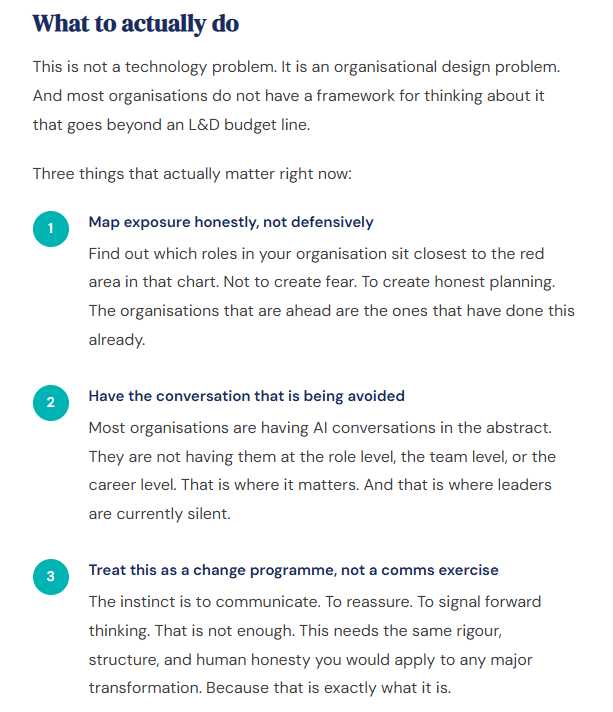 The most exposed workers are more likely to be female, more educated, and higher paid. The people running AI strategy sessions are often the ones most at risk from them. More likely to be female. More likely to hold a degree or postgraduate qualification. Earning 47% more on average than the unexposed group. Graduate degree holders are four times more represented in the most exposed cohort than in the least exposed one. This is not a story about automating low-wage, low-skill work. That was always the assumption. The data says otherwise. The people in your organisation leading change programmes. Designing strategy. Running HR. Producing analysis. Writing reports. They are the ones the data is describing. "The people telling their organisations to prepare for AI are often the ones the data says are most exposed to it." What organisations are actually doing about thisNot much. Not yet. Not honestly. The response so far has been mostly performative. AI literacy sessions. A new policy. A working group with no mandate. A culture survey asking people how they feel about change. These are not strategies. They are the motion that replaces strategy when organisations are not ready to confront the real question. The real question is not "how do we help our people use AI?" It is "what does this organisation actually look like in three years, who is in it, and what are they doing?" Most leadership teams cannot answer that. Because answering it honestly requires a conversation that nobody has opened yet. The data says there is still time. The gap is real. Deployment is lagging behind capability. But the same data shows that the gap is closing. And the organisations that wait for the gap to close before they act will find they have run out of runway at exactly the moment they need it most. This is not a technology problem waiting for a technology solution. It is a people problem. Right now. In front of you. If this landed, send it to someone who needs to read it. Source: Anthropic, "Labor Market Impacts of AI: A New Measure and Early Evidence," March 2026. Maxim Massenkoff & Peter McCrory. More like this every week. If this landed, share it with someone who needs to hear it. |