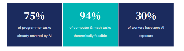 Blue: what AI could theoretically do. Red: what it is actually doing. The gap is what organisations are ignoring. The red area is not small. But the blue area dwarfs it. Particularly in Office and Admin (90% theoretical capability, a fraction deployed), and Computer and Math (94% theoretically possible, only 33% currently observed). This is not a sign that AI will not arrive. It is a sign that it has not fully arrived yet. Two very different things. The jobs most exposed right nowWhen you look at which specific roles are already seeing the highest AI task coverage, the list is striking.